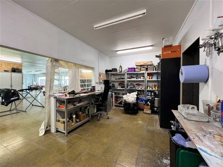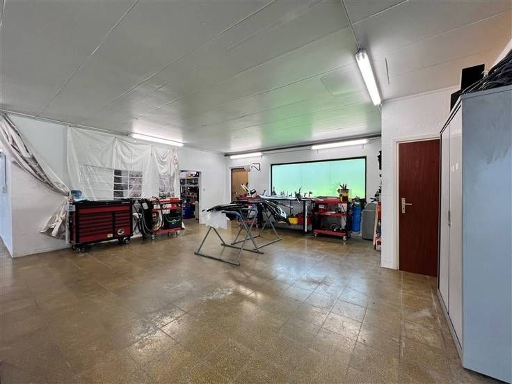 HANDEL - WERKPLAATS - GARAGE - LAND Ruime werkplaats/garage te koop ideaal gelegen aan de rand van de N97. Werkplaats van xxx m² inclusief 2 garages op een perceel van bijna 21 are EN bouwgrond van 19 are 52 ca. Gemakkelijk parkeren aan de voorzijde van het gebouw.