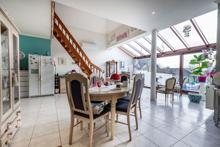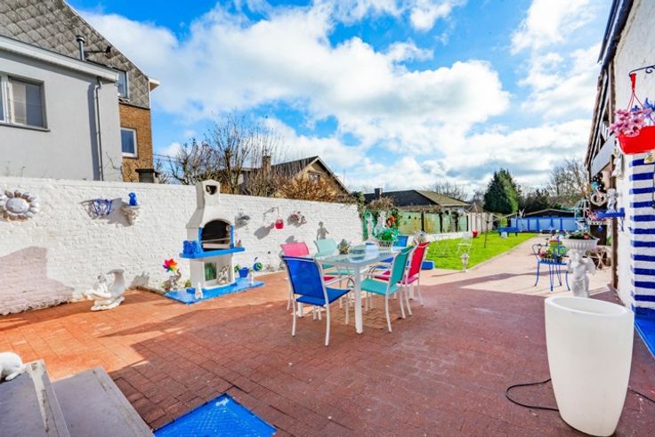 Belle maison située à proximité du centre comprenant: Rez: hall d'entrée - Living avec véranda et mezzanine (très lumineux) - cuisine équipée - Buanderie - SDB + douche + WC - Etage: Hall de nuit - 2 belles chambres - Poss. 1 grande chambre à finaliser - Cave en sous-sol - Extérieurs: passage latéral privatif - Terrasse - Beau jardin - remise - CC Gaz - Châssis bois/PVC DV - PEB Label G 605 Kwh/m².an - Citerne eau de pluie + groupe - A découvrir - Faire Offre à partir de 245.000€ (L'agent n'a aucun pouvoir de décision quant aux offres reçues)