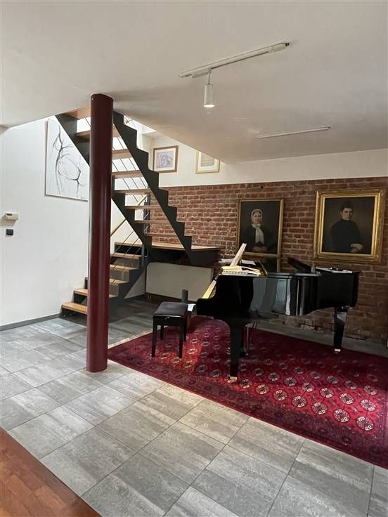 Rez-de-chaussée : terrasse (23m2), grand séjour (43m2), dégagement avec vestiaire et wc, cuisine (8m2), buanderie (12m2);