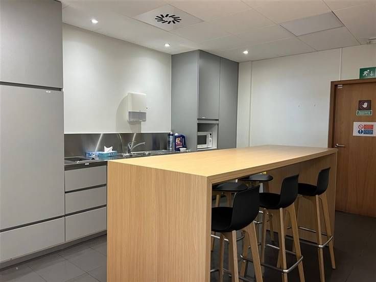 De gelijkvloerse ruimte bestaat uit open ruimte, enkele afzonderlijke vergaderruimtes/bureaus, een geïnstalleerd keuken eiland, een keuken en bergruimte.