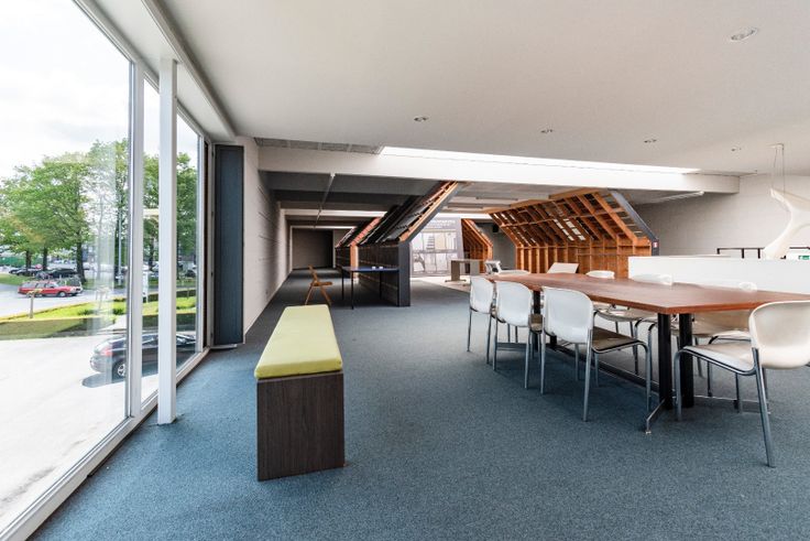 Naast de showroom zijn er ook verschillende burelen, zowel gezamenlijke als aparte bureauruimtes. Verder biedt het pand ook nog een vergaderzaal aan, sanitaire ruimtes en een keuken. De burelen zijn 365 m² groot. Prijs: € 65/ m² per jaar.