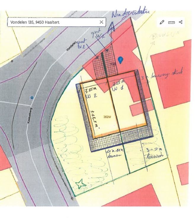 Gezien de noord-oriëntatie zich op de kopse zijde van het perceel bevindt, werden de woningen met de voorgevel ingepland richting “Vondelen”. Met als gevolg dat de inkom, oprit en toegang naar de garage zich beiden naar “Vondelen” situeren. Woning 1 is zijdelings voorzien van een bouwvrije strook van 3 meter en een tuindiepte van 8 à 9 meter. Woning 2 creëert iets meer openheid gezien het hoekperceel en beschikt over een tuindiepte van 10 à 11 meter. Dit alles naargelang welke bouwdiepte er gebouwd wordt op het gelijkvloers. Maar in de studie is deze gebaseerd op 12 meter. De tuinen en terras zijn Zuid -georiënteerd.