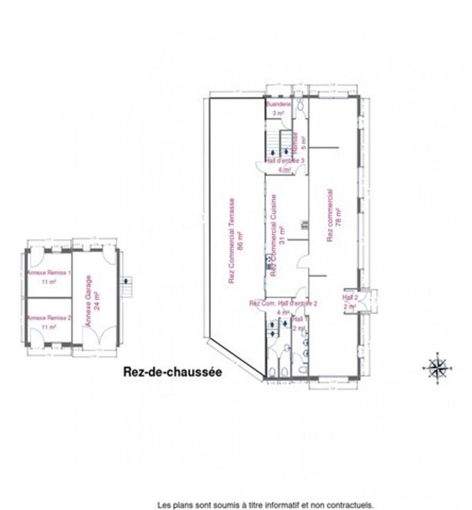 - RDC: salle de restaurant, cuisine professionnelle, sanitaires, remises, et terrasse à l'arrière plein ouest. Petite annexe avec remises/ Restaurant toujours en activité (actuellement sous bail commercial)