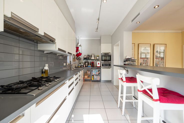 Halfopen keuken (2009) op tegelvloer met ontbijttoog, gasvuur, dampkap, koelkast, diepvries, microgolfoven en heteluchtoven.