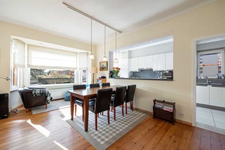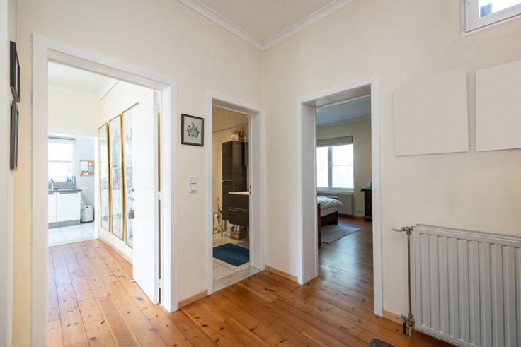 Ruime inkomhal op plancher met toegang tot de lichtrijke woonkamer in L-vorm (32,50m²).