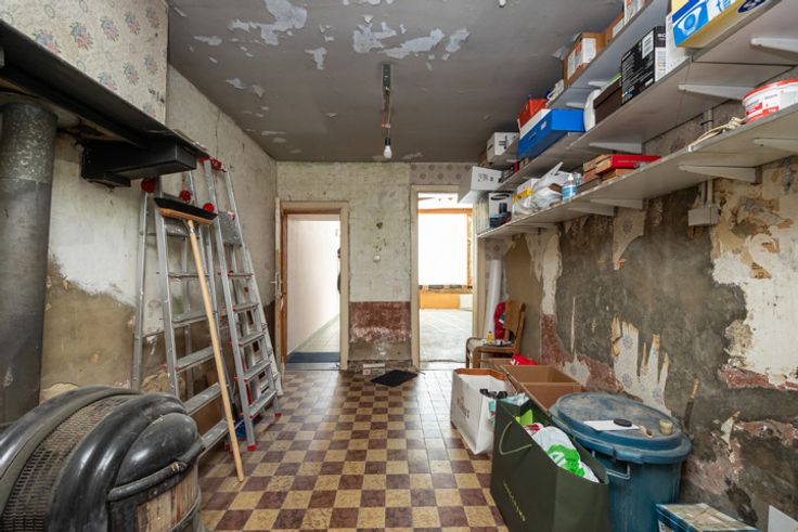 Toegang tot een te renoveren doorloopkamer die perfect kan dienen als bureauruimte / vestiaire / wasplaats.