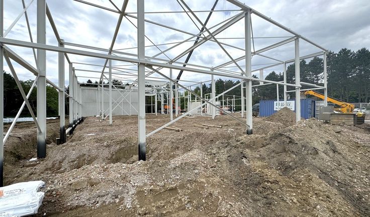 Specificaties: staalstructuur, 6m vrije hoogte, automatische sectionale poort, geïsoleerd steeldeck dak met centrale lichtstraat, polybetonvloer, afvoer sanitair, rookluiken