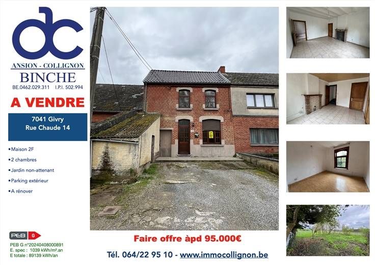 Sorry er is geen nederlandse vertaling beschikbaar. *** SOUS COMPROMIS *** Givry, à vendre, maison 2F à rénover en partie, se composant comme suit : Au rez-de-chaussée : pièce de séjour et cuisine (à installer). A l'étage : 2 chambres, salle de bain avec wc. Grenier aménageable et cave. Cour et jardin non-attenant (accès via servitude de passage) de +/- 4A 80Ca. Parking extérieur et remise (située à l'avant de la maison). Double vitrage bois, volets, toiture de rénovation récente, installation de chauffage à prévoir. Visites et renseignements au 064/22.95.10 Faire offre à partir de 95000€ PEB- G, N°20240408000891,E. spec 1039kWh/m² - E totale : 89139 kWh/an.