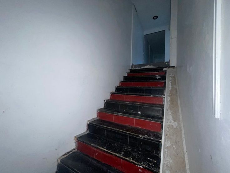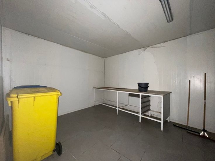 Composée : Belle vitrine à rue avec un espace commercial de +/- 285m², w.c. homme et femme, coin bureau, chambre froide et une pièce de +/- 60m² à l’étage. Vue de la mezzanine vers le rez-commercial.