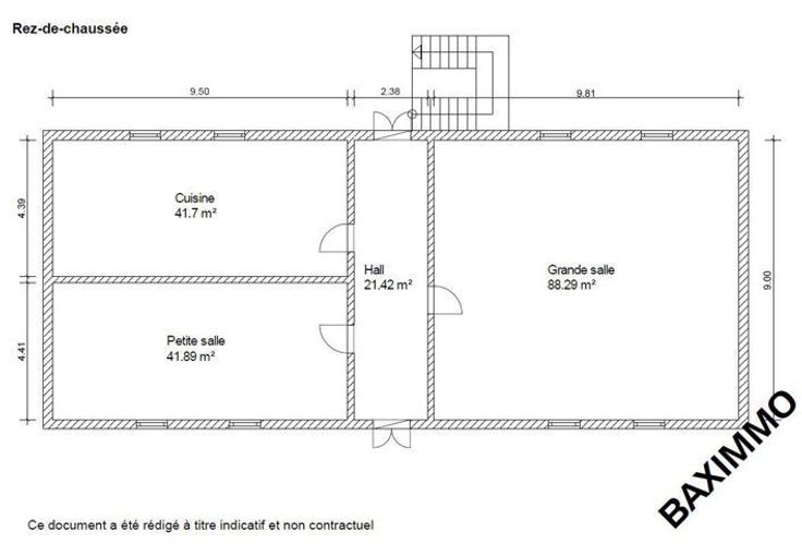 Rez-de-chaussée : Hall d’entrée, séjour, cuisine, petite salle et grande salle.