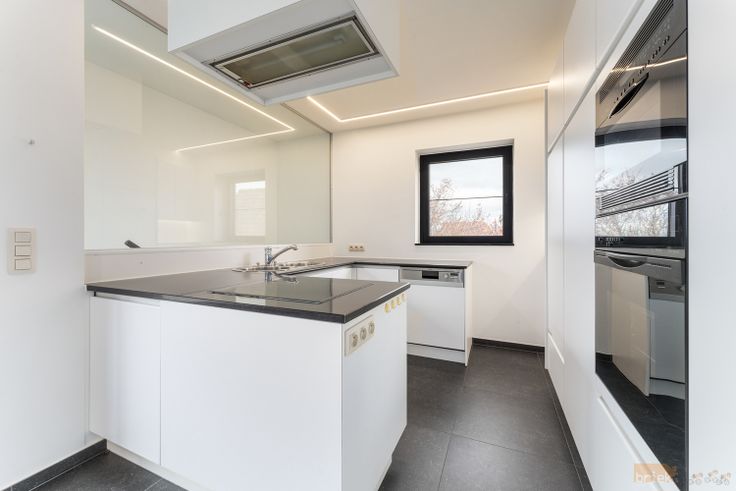 Via de inkomhal kom je in de ruime en lichtrijke leefruimte, waar het licht binnenstroomt dankzij de vele hoge glaspartijen. De strakke witte open keuken met watereiland en heel wat bergruimte is heel uitnodigend om aan het kokerellen te gaan. Een echte meerwaarde aan deze residentie is dat ook buiten genieten hier volop kan: er zijn 2 ruime terrassen en een grote achterliggende tuin.