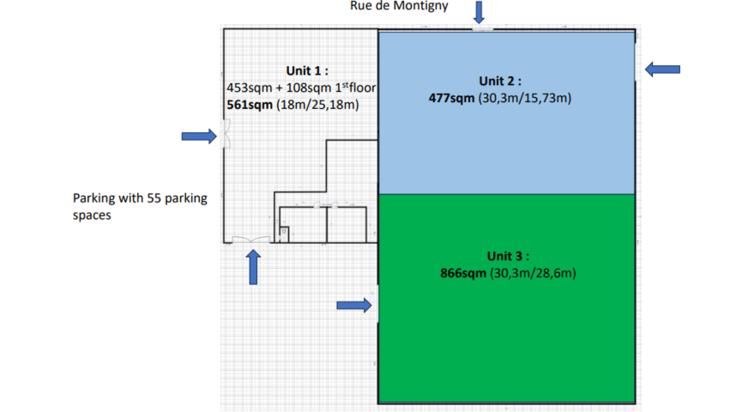 Dit magazijn is ideaal gelegen aan de rand van de Ringweg, bij de afslag Montigny sur Sambre. Het bevindt zich in het eerste gebouw op de hoek, tegenover Volvo en in de buurt van talrijke winkels (Lidl, Action, enz.).