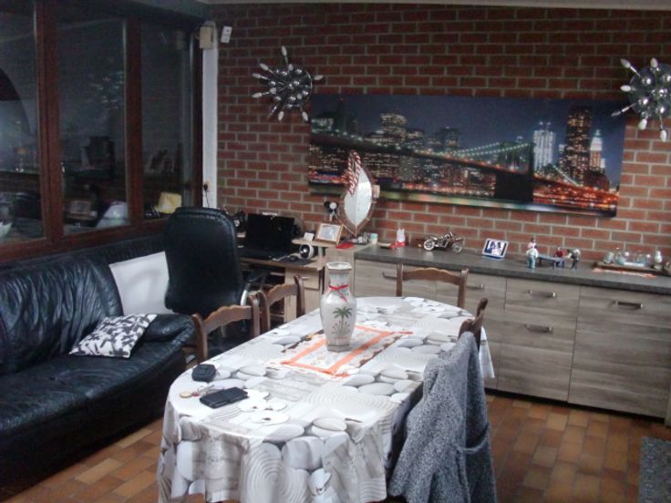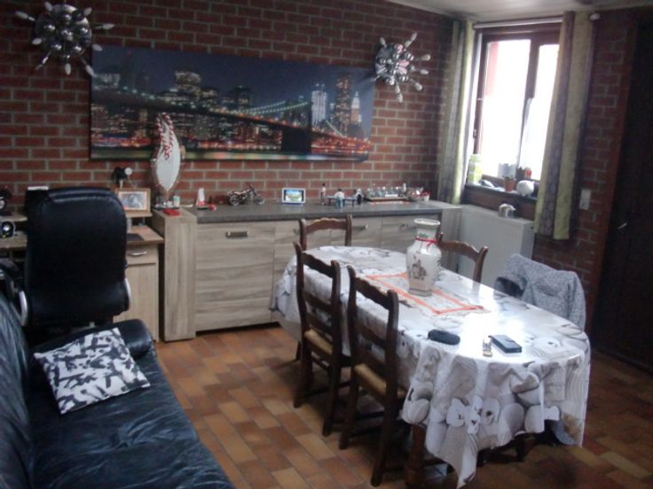 Comprenant : une cave, hall d'entrée avec corridor, bureau, living double, salon avec insert au bois, salle de bain avec douche, meuble vasque, bidet et w-c, cuisine hyper équipée avec vitro, hotte, frigo, four traditionnel et lave-vaisselle, terrasse avec jardin et remise à l'arrière.