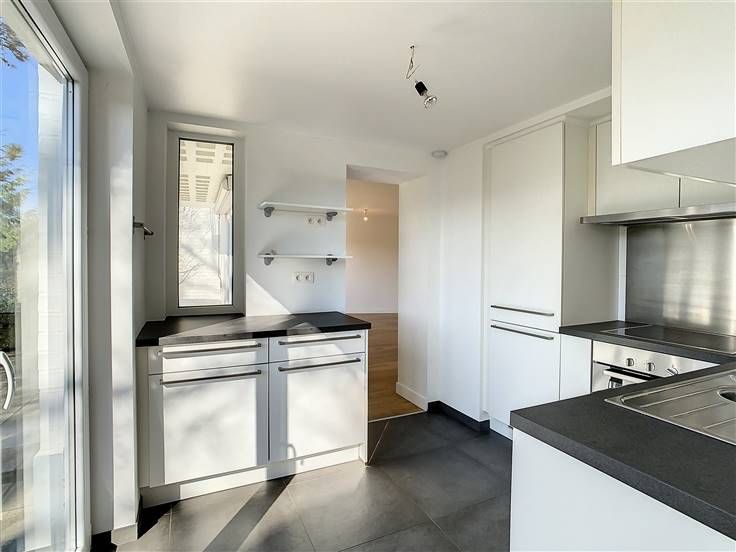 Fort-Jaco, licht appartement volledig gerenoveerd in 2017 van ±70 m² gelegen op de begane grond van een klein goed onderhouden gebouw en omgeven door groen. Het bestaat uit een inkomhal met vestiaire, een lichte woonkamer van ±28 m² met toegang tot het prachtige terras van ±30 m² op het zuidwesten, een volledig uitgeruste keuken (oven, kookplaten, afzuigkap, koelkast, vriezer, vaatwasser), een mooie slaapkamer van ±14 m² zonder vis-à-vis, een badkamer (ligbad, 2 wastafels, wc), een grote kelder. Parket, dubbele beglazing, individuele gasketel. Nabij winkels, scholen en vervoermiddelen. Kosten: 100€/maand (provisie: commons, trustee). Buiten parkeerplaats 100€/maand (verplicht). De metingen worden alleen ter informatie gegeven. De positievepunten: locatie +++, rustige omgeving en dicht bij Fort Jaco (te voet), groot goed georiënteerd terras, parkeerplaats. Beschikbaar: 01/04/2022. Bezoeken en info: 0474/32.54.05