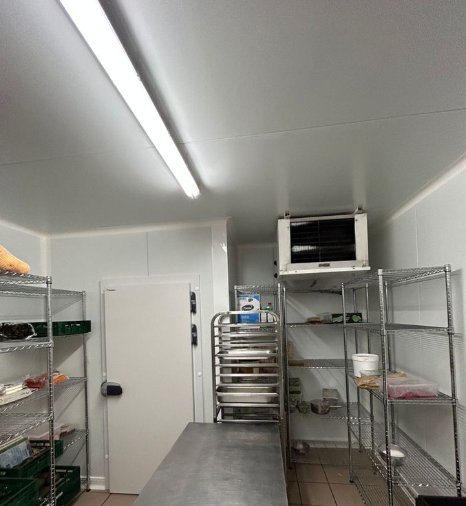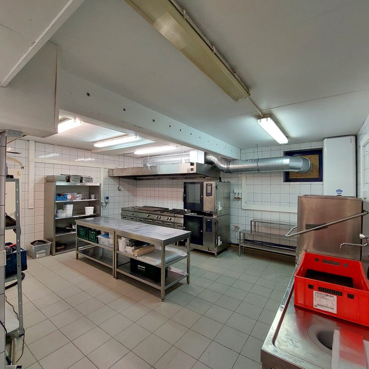 Un espace de stockage sec, un espace de stockage froid positif (+4°), un espace de stockage froid négatif (-20°), four pro de 10 étages (convection/vapeur), fourneaux 6 becs, tables de travail, plonge, lave vaisselle pro, coupe légume, célule de refroidissement rapide, sous videuse, gestion des poubelles,...