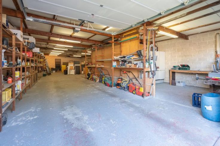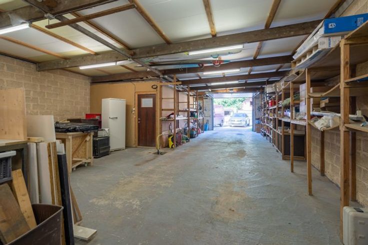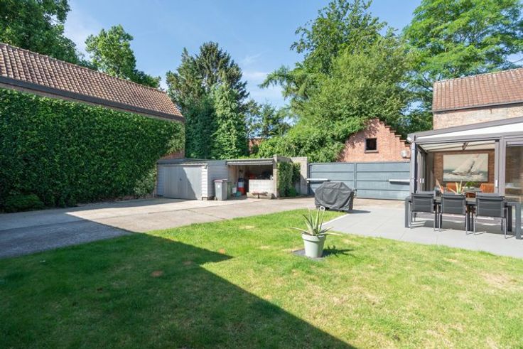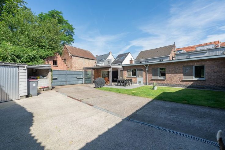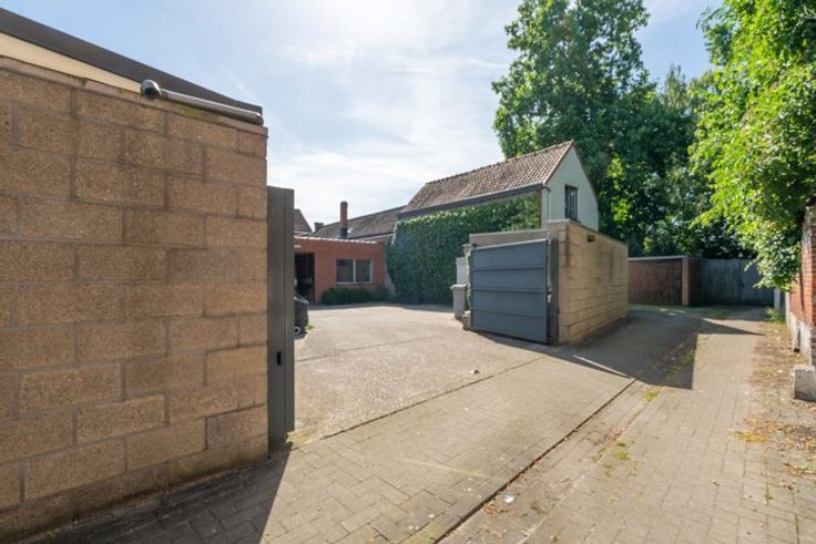 Brede toegangspoort voor toegang tot het multifunctioneel magazijn (± 200m²). Kleine garage en tuin. Elektriciteit is conform! Zeer gunstig EPC Label-B!