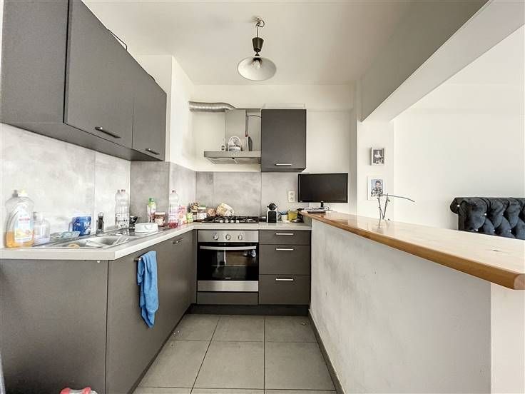 SAMENSTELLING - Inkom - Woonkamer - Half ingerichte open keuken - Doucheruimte met WC CHARACTERISTIEK - Gebouw uit 1976 - Recent dak - Lift - PVC ramen met dubbele beglazing (+/-2010) - Individuele gasketel - Vloerbedekking: