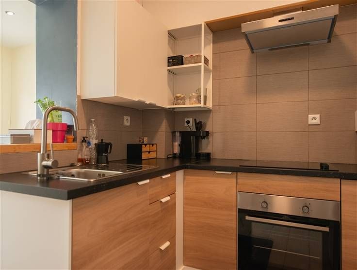 Gelijkvloers: leefruimte (20m²), ingerichte keuken + eetplaats (14m²) uitgevend op het terras en de grote tuin.