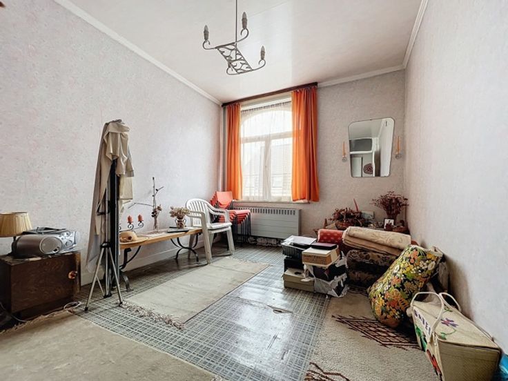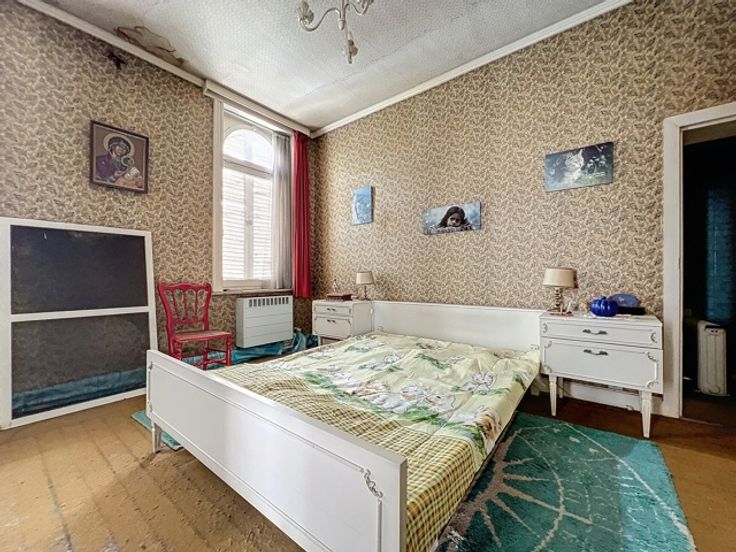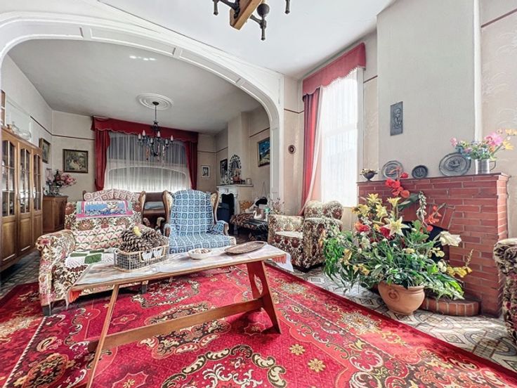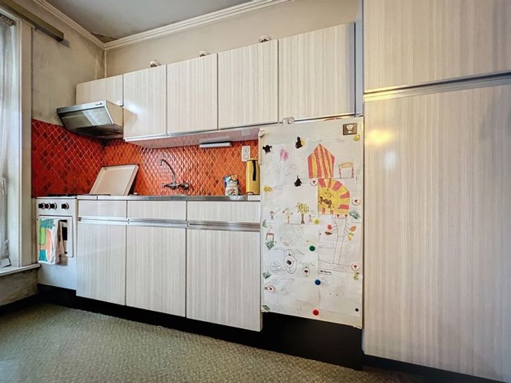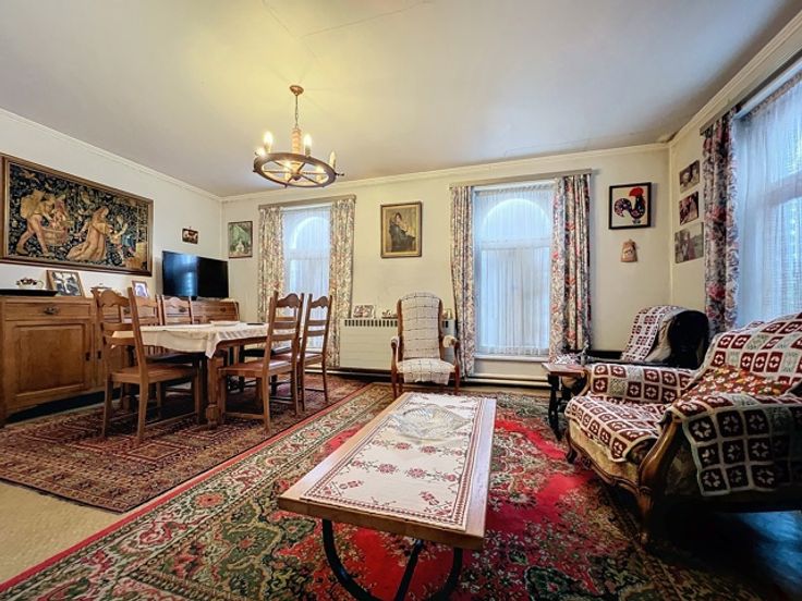 Cette maison jumelée offre quatre chambres, un grand jardin, un sous-sol avec cave, un rez-de-chaussée avec hall d'entrée, WC, cuisine équipée, salle à manger lumineuse, salon confortable et hall. Au premier étage, un appartement avec living, cuisine équipée, chambre et salle de douches, ainsi que trois chambres dont une avec salle de bains. Le deuxième étage dispose d'un grenier aménageable. À l'extérieur, un grand jardin clôturé et de nombreux garages complètent l'ensemble.