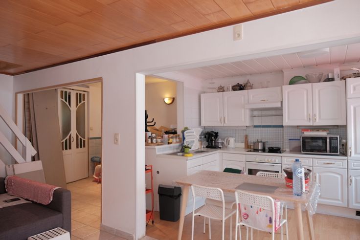 En entrant vous découvrez la pièce de vie lumineuse avec une cuisine ouverte semi-équipée.