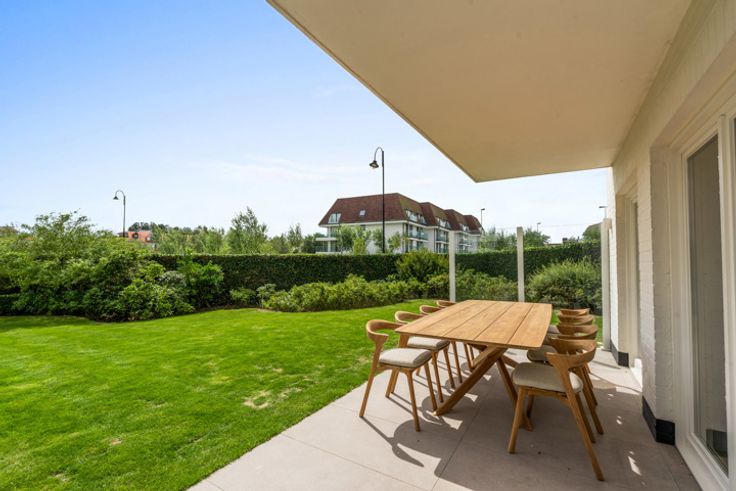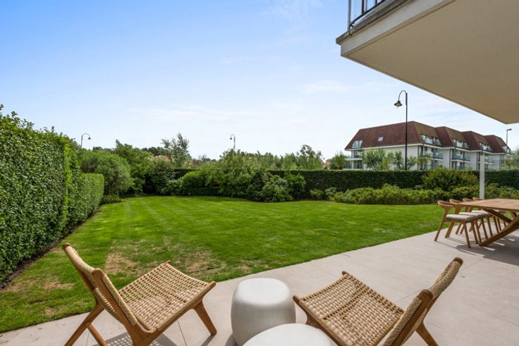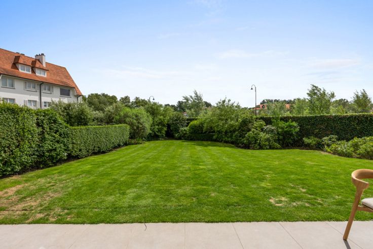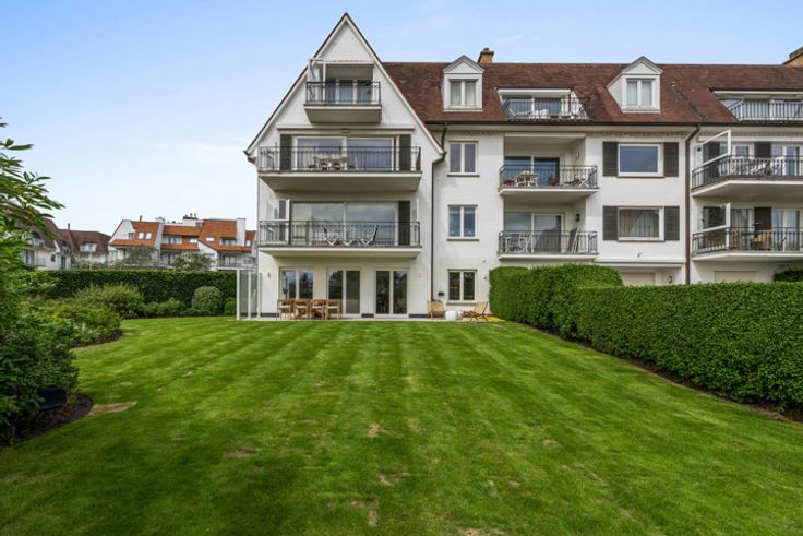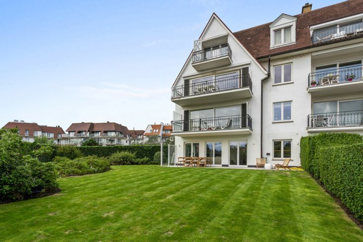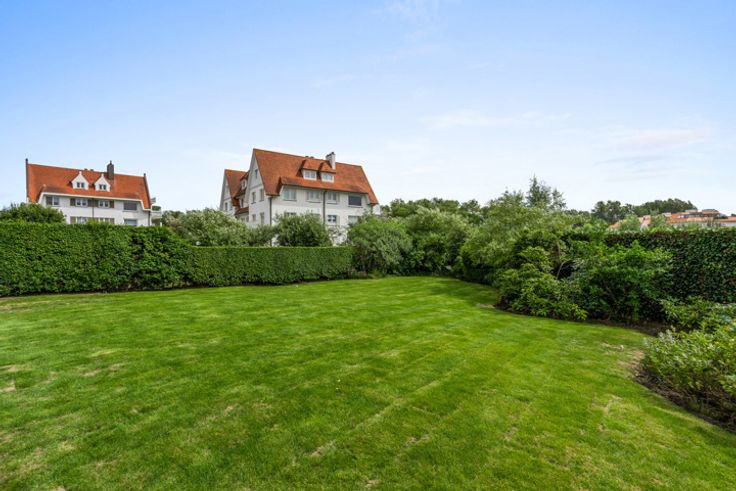 Luxueus, volledig gerenoveerd hoekappartement met een mooie, perfect aangelegde tuin, te koop in een gerenommeerde villawijk in het Zoute, vlakbij het strand, het Zwin en de Royal Zoute Tennis Club. Het appartement kent volgende indeling: Inkomhal met vestiaire en gastentoilet. Ruime woonkamer met zicht over de zongerichte tuin, voorzien van een zithoek, eethoek en volledig ingerichte open keuken voorzien van alle comfort en luxe (Miele-apparatuur). De leefruimte heeft mooie grote ramen over de volledige breedte met zicht op de tuin en zonneterras op het zuiden. De nachthal leidt naar drie slaapkamers. De hoofdslaapkamer is voorzien van ingebouwde kasten, bureauhoek en een privatieve badkamer met dubbele wastafel, ligbad, inloopdouche en toilet. Tweede slaapkamer, eveneens met ruimte voor een tweepersoonsbed en ingebouwde kasten. Derde volwaardige slaapkamer momenteel ingericht met stapelbed, bureauhoek en ingebouwde kasten. Aparte doucheruimte (douche en wastafel). Praktische berging / wasplaats met aansluitingen voor wasmachine. Deze villaresidentie is centraal doch rustig gelegen, op een boogscheut van de wandeldijk en op wandelafstand van de winkels van het centrum van het Zoute. Het appartement hoogwaardig afgewerkt en voorzien van alle comfort (vloerverwarming, alarm, elektrische rolluiken, automatische raamdecoratie etc.) Er is tevens een conciërge aanwezig in het gebouw, optimale veiligheid. Ruime privékelder met stopcontacten en gemeenschappelijke fietsenberging