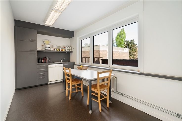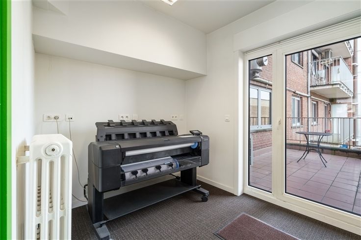 ·1ste verdieping: bureaus, archief, printerlokaal en geïnstalleerde keuken uitgerust met enkelvoudige gootsteen, vaatwas, koelkast en kastruimte. Op deze verdieping is tevens een noord georiënteerd terras.