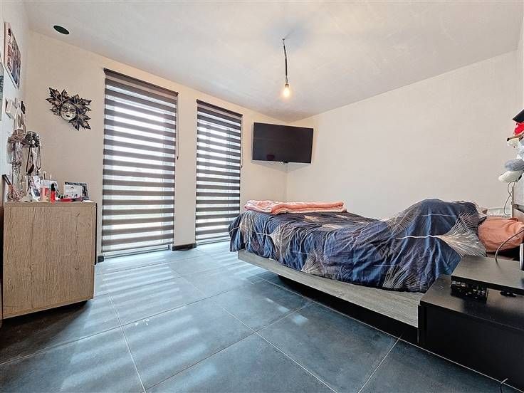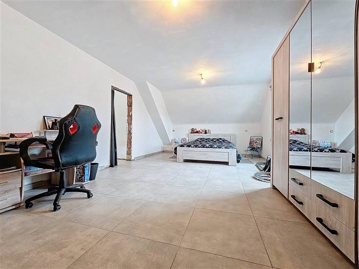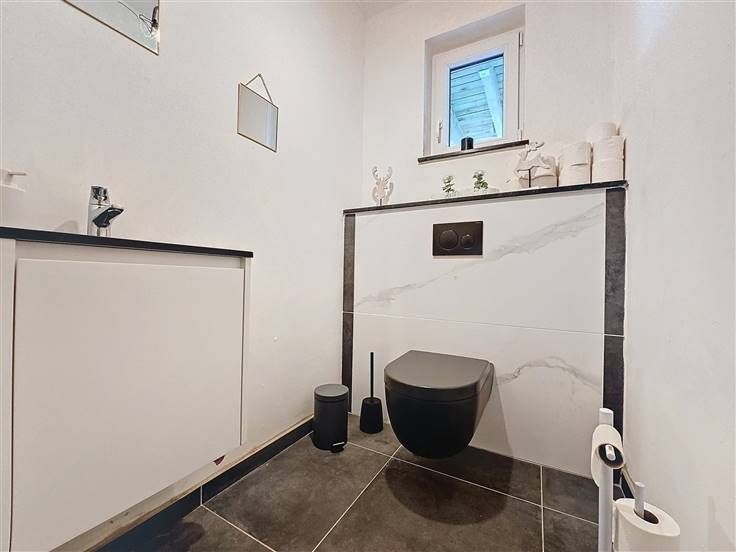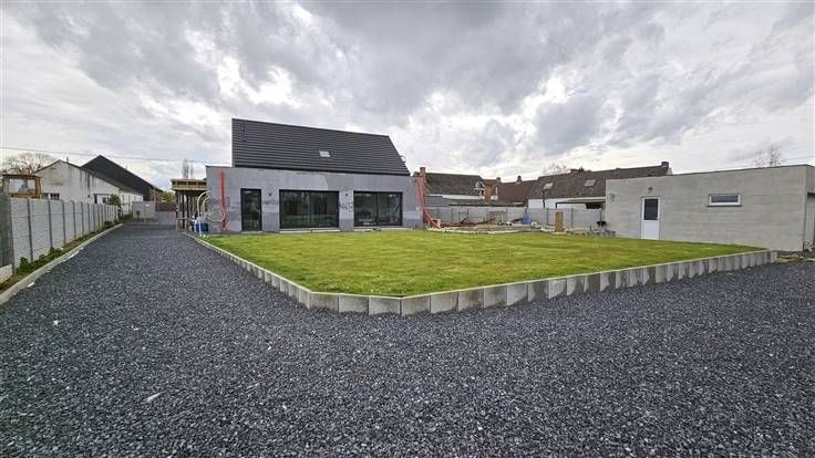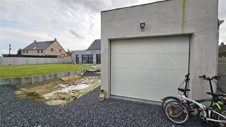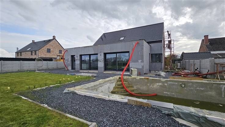 Rez: Hall d'entrée, bureau, WC séparé, suite parentale (chambre, dressing, salle de bains), grand living avec cuisine intégrée, cellier, cour, vestiaire, grand jardin (avec piscine à terminer), grande remise/garage et emplacements de parkings sur le coté droit et l'avant du bâtiment (le portail à rue est livré avec la maison et sera à place par l'acquéreur).