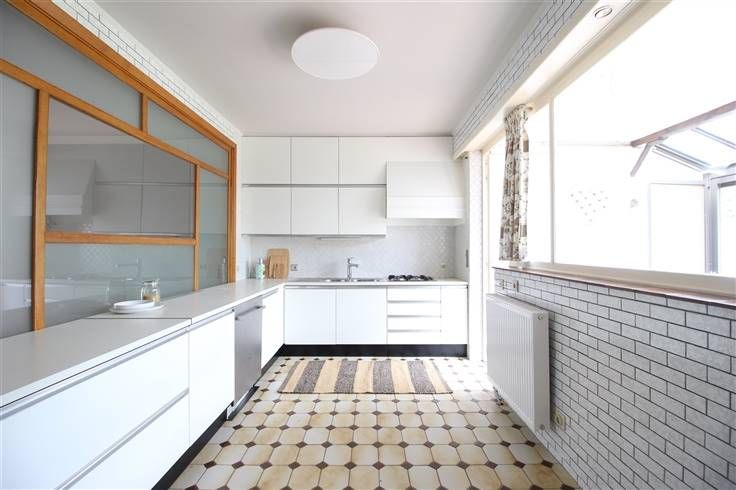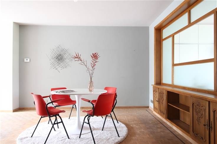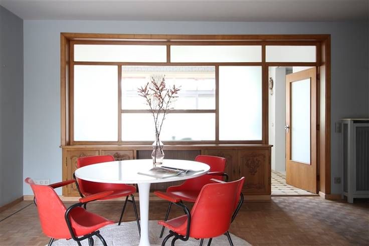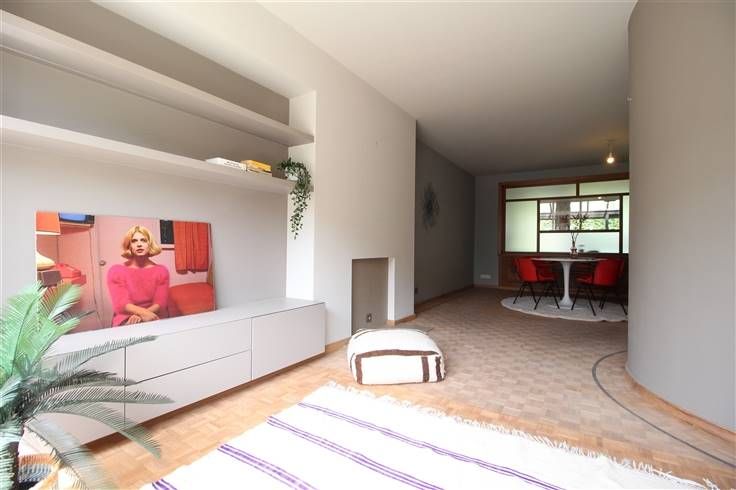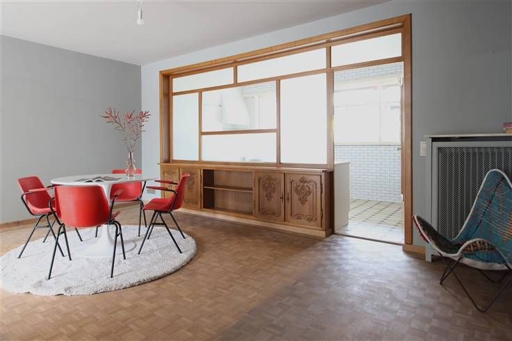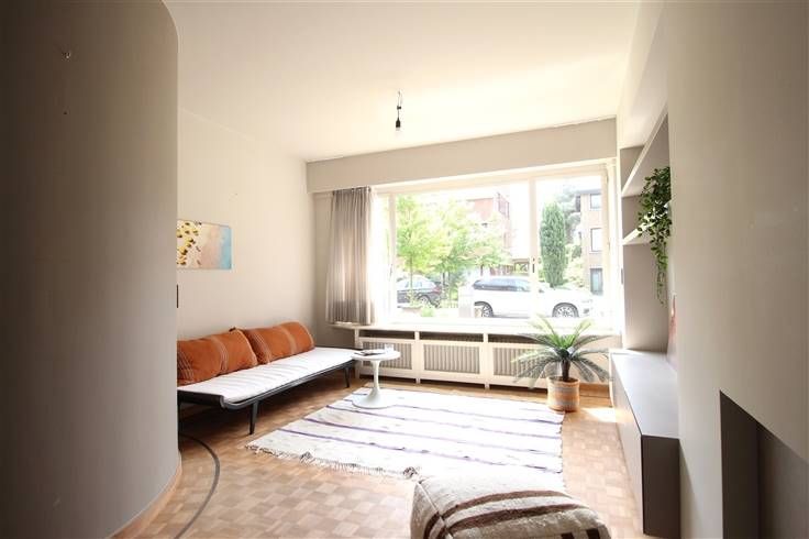 Living/studio en eetplaats op kwalitatieve blokjesparket, achteraan verzorgde keuken en recente badkamer.