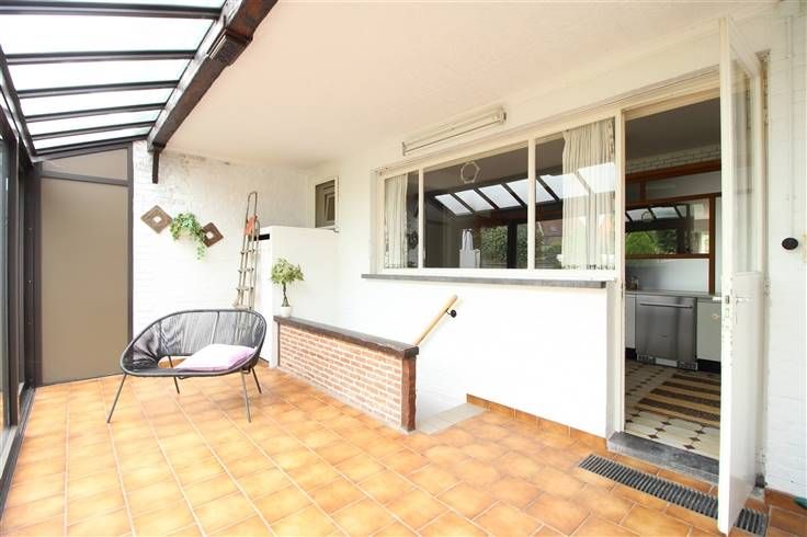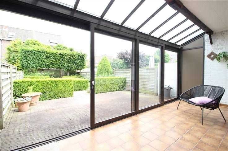 Tot slot is er een overdekt terras met grote schuiframen richting de prachtig aangelegde tuin.