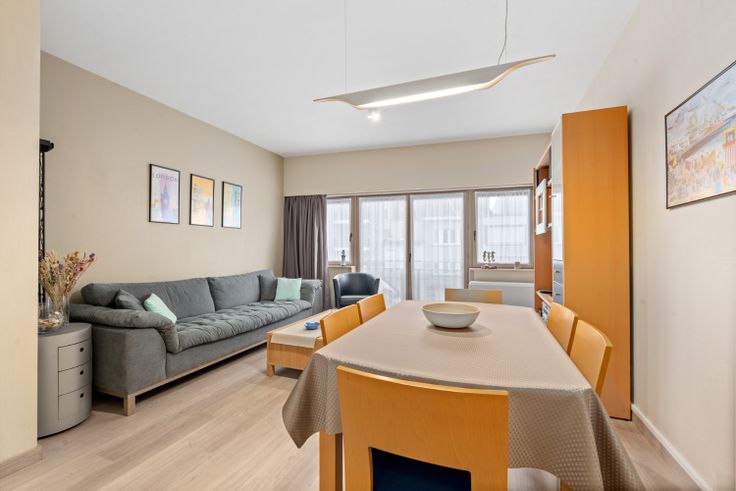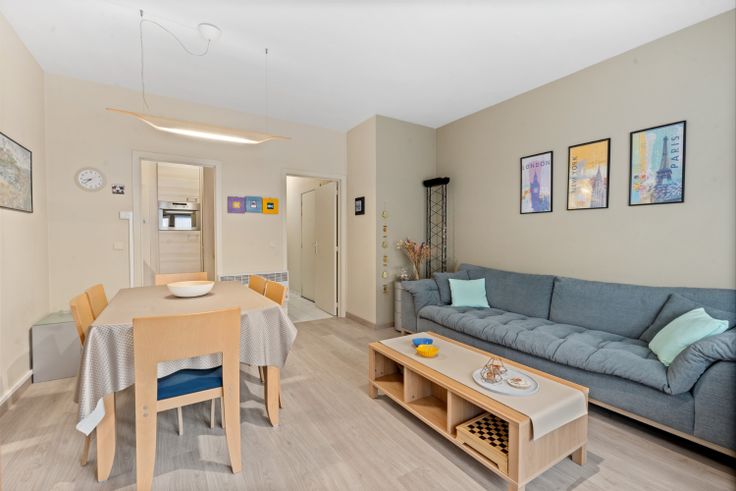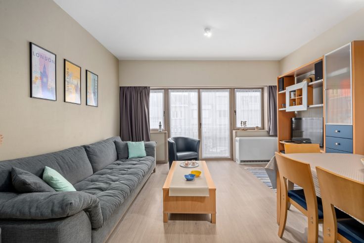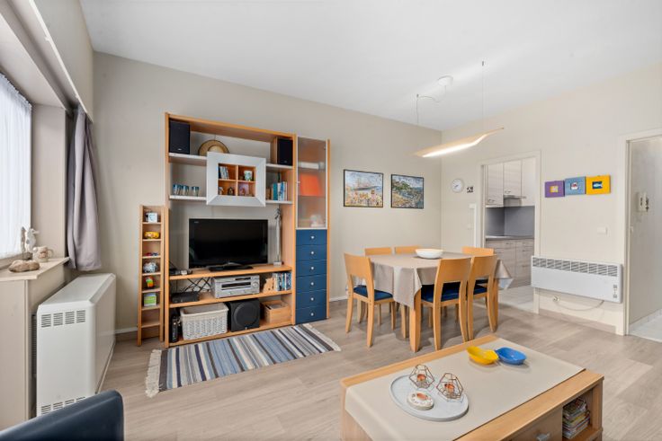 Dit ruime twee slaapkamer appartement heeft een uitstekende ligging vlakbij zowel het strand als het centrum van Blankenberge. Bij het binnenkomen bevindt zich aan de linkerzijde een lichtrijke leefruimte met aanpalend een vernieuwde keuken met de nodige basisvoorzieningen. Aan de achterzijde van het appartement bevinden zich twee ruime slaapkamers elk voorzien van elektrische verwarming. Overigens wordt ook de rest van het appartement verwarmt met elektrische accumulatoren. Tussen de leefruimte en de slaapkamers situeert zich nog de badkamer voorzien van een ligbad en dubbele lavabo.  Het appartement is deels vernieuwd en volledig instapklaar. In zowel de leefruimte als de slaapkamers is een kwalitatieve laminaat vloer geplaatst. Verder beschikt het gebouw nog over een algemene fietsenberging.  Het appartement is gelegen op het gelijkvloers in een gebouw daterende uit 1990. Het appartement wordt verkocht met de meubels. De hoge energetische waarde is ten gevolge van het onderliggende garagecomplex. De waarde kan gemakkelijk verbeterd worden door isolerend materiaal aan te brengen onder de draagvloer van het appartement (bereikbaar via het garagecomplex). Renovatieplicht: ja