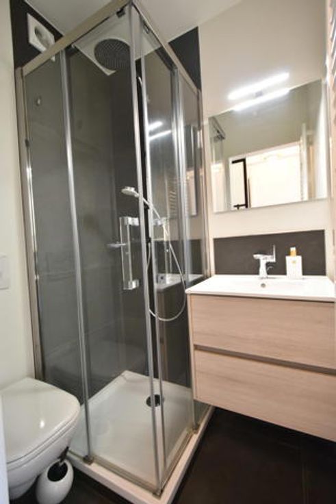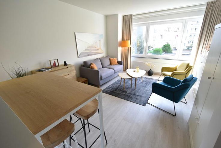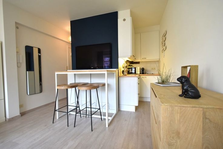 INSTAPKLARE 'PIED-À-TERRE' GELEGEN IN DE ZOUTELAAN. Samenstelling : inkomhall met vestiaire, badkamer met douchecel, lavabo en wc, lichtrijke woonkamer met een open zicht en een ingerichte kitchenette. Elektrische zonnestore. Mogelijkheid garage !