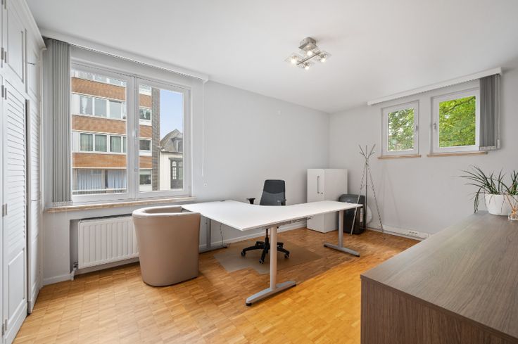 Op de begane grond is er een ruime hal, met een 2 toegang langs de straatzijde van het gebouw, met vestiaire, kantoorruimte, een toilet, een receptie, een bergruimte en een terras. Op de eerste verdieping zijn er vier ruime kantoren, waaronder drie met ingebouwde kasten, een doucheruimte met toilet en een kantoor met privébadkamer.