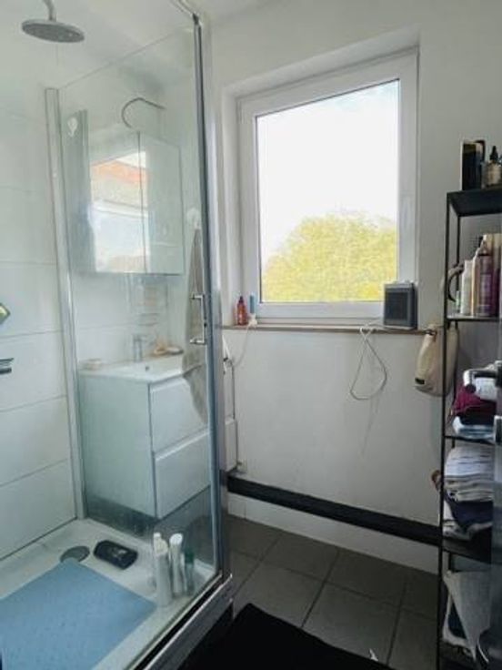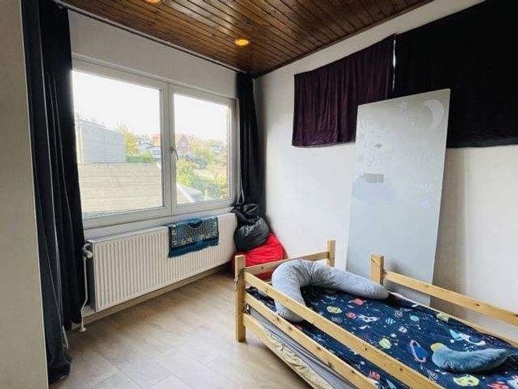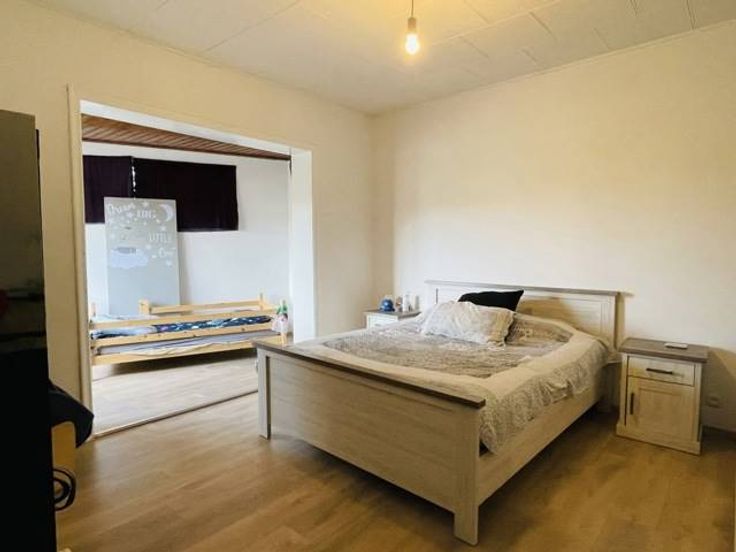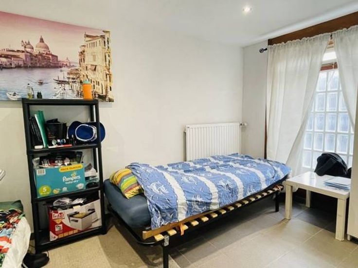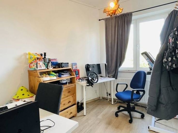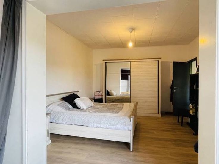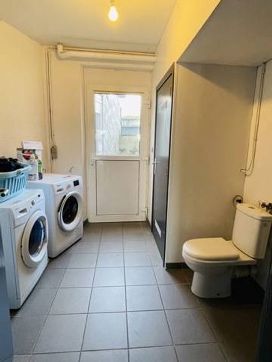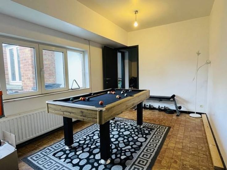 Rez-de-chaussée : hall d’entrée, buanderie/chaufferie, 1 chambre (12m2) avec dressing, 2 pièces de rangement en enfilade(6m2+5m2), une salle de jeu/chambre de 12m2, garage (17m2) et une cour de +/- 20m2.