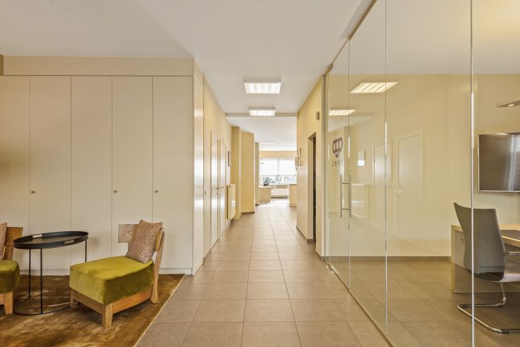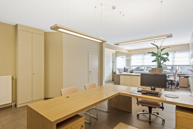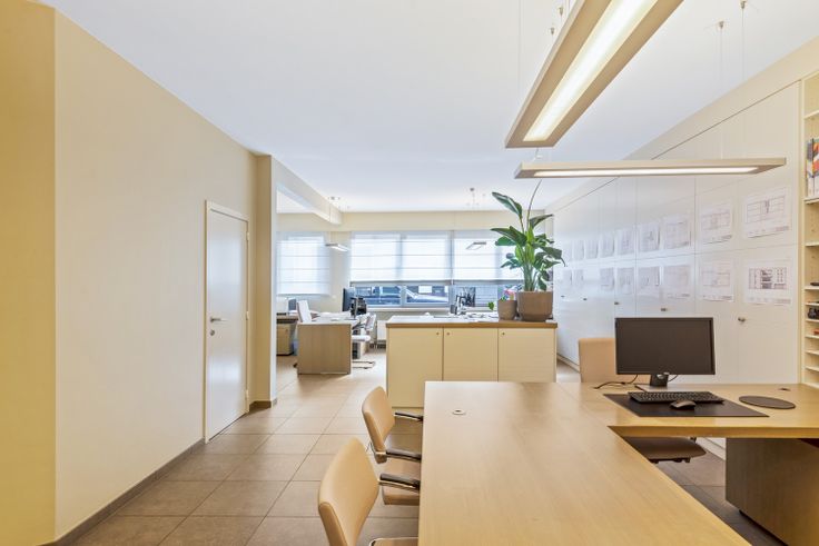 U komt binnen in de ruime kantoorruimte (64m²) vooraan die doorloopt naar de lounge/zitruimte (22m²) achteraan. Deze ruimte geeft tevens toegang tot het ruime terras. Aangenaam om even een lunchpauze te nemen.