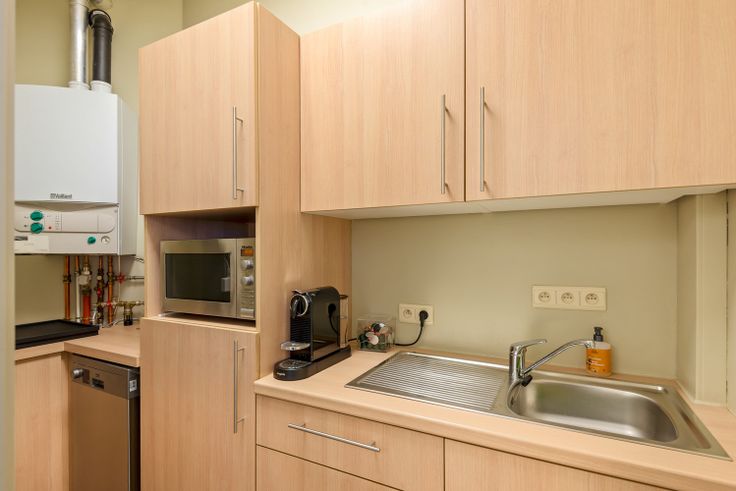 Het kantoor beschikt tevens over een keuken uitgerust met een spoelbak met verlek, microgolfoven en vaatwasser.