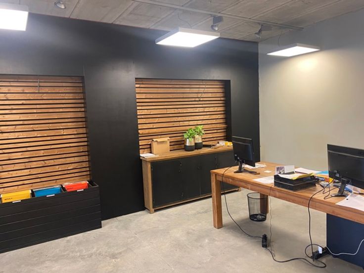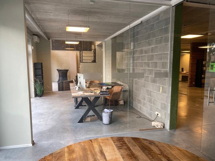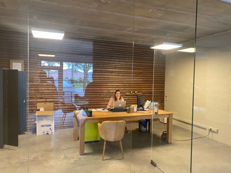 Tot slot geven de moderne scheidingswanden van glas het interieur een eigentijdse en open uitstraling, ideaal voor een professionele werkomgeving.