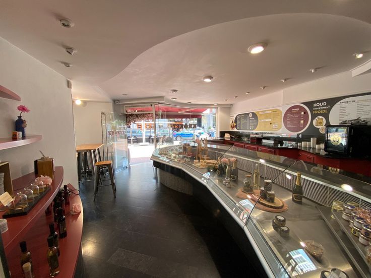 Indeling: winkel, bureel, ingerichte keuken met professionele uitrusting, bergplaat, koelcel en koper. Achteraan is er nog een ruime koer die overbouwd mag worden. Ruime privatieve kelderberging, rechtstreeks toegankelijk vanuit het handelspand.