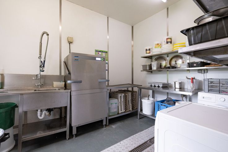Verdieping 1: Modern ingerichte industriële keuken, personeelsvoorzieningen, bergplaats. 7 hotelkamers