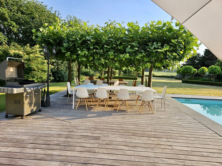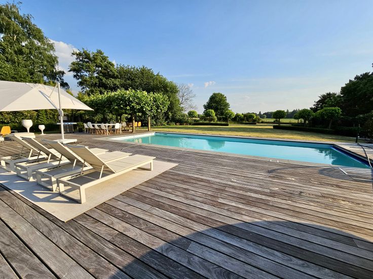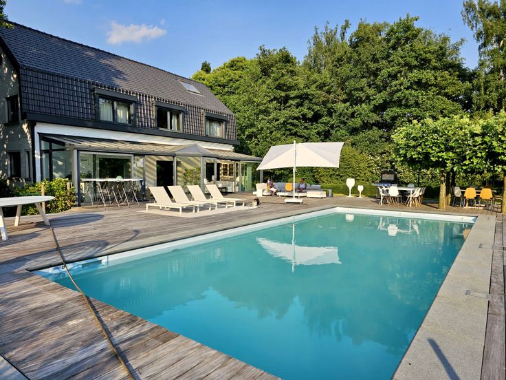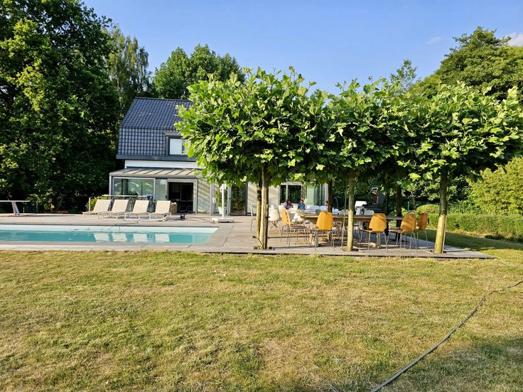 Aan de voorzijde is er voldoende parkeerruimte aanwezig. Langs de achterzijde vinden we een mooi aangelegde tuin met een groot zonneterras, een zwembad en een bijgebouw.