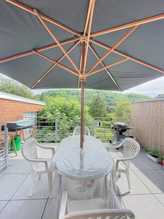 Buiten kunt u genieten van een grote garage – werkplaats van 41m², een zonnig terras van 20m² en een tuin van 220m², alles op het zuidoosten georiënteerd.