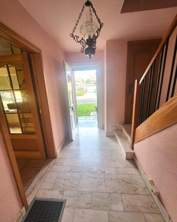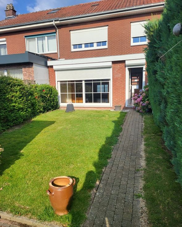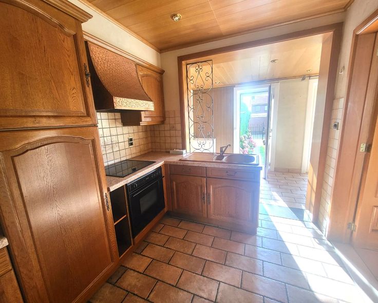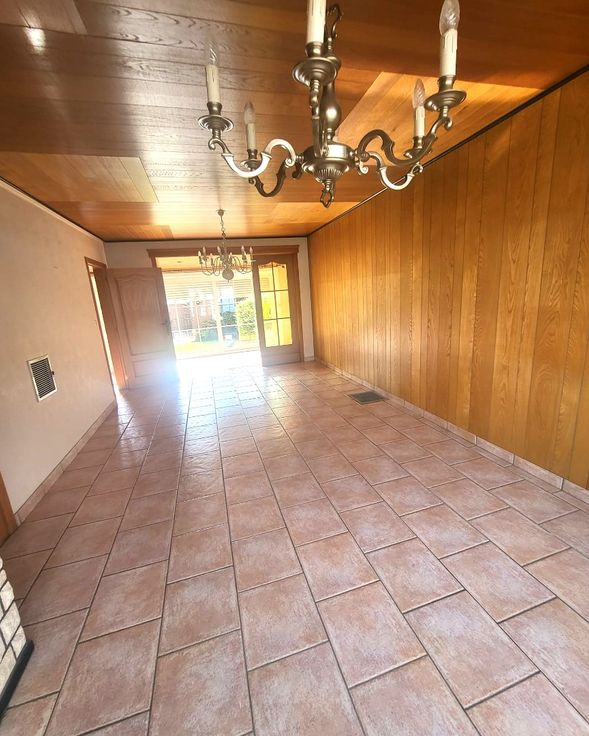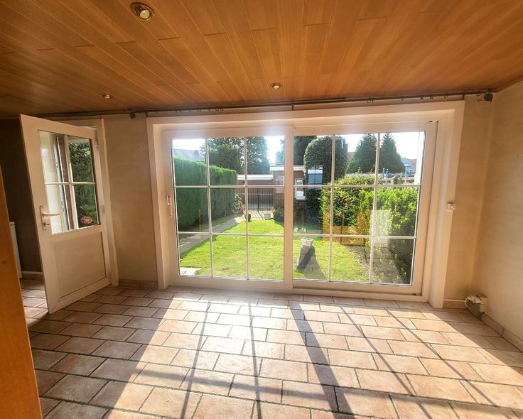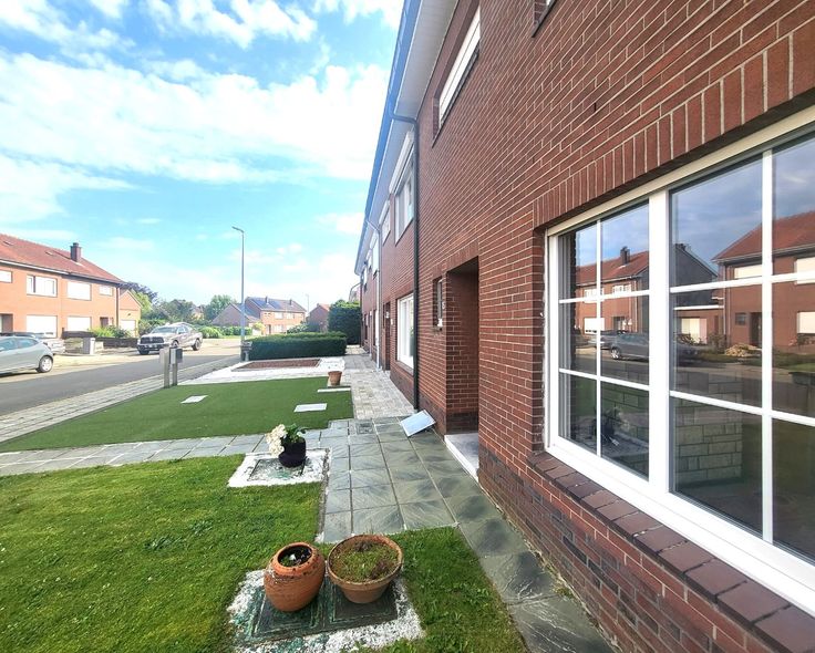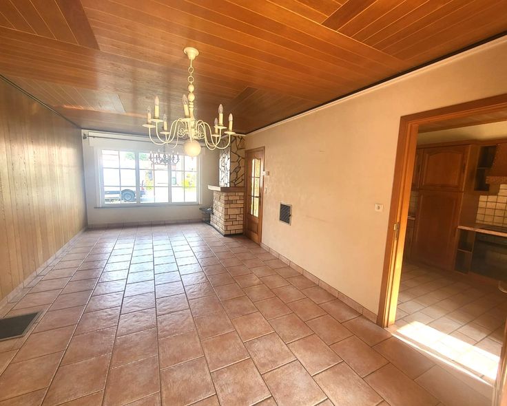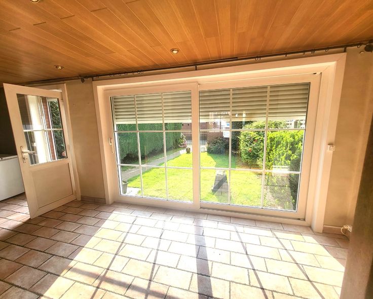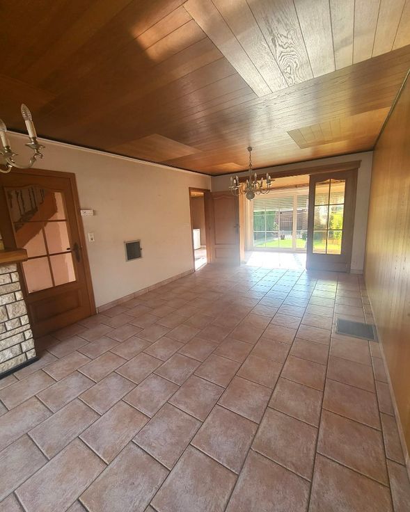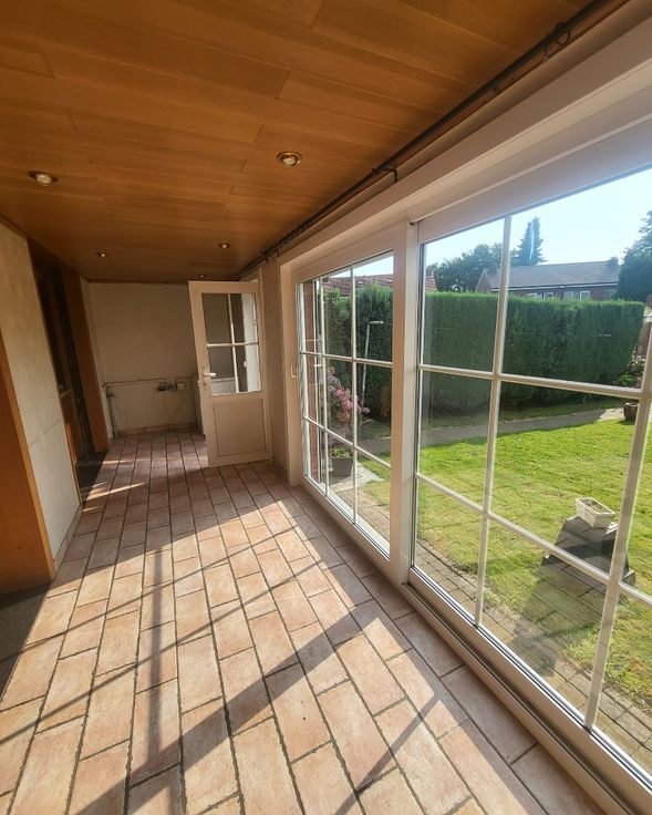 Indeling : inkomhall - woonkamer + veranda/zithoek met zicht op de tuin - keuken.