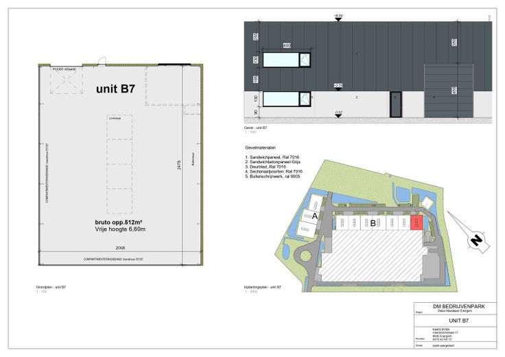 DM-bedrijvenpark is een ambitieus project bestaande uit 2 moderne gebouwen op bedrijventerrein 'Grote Nest'. Het project bestaat uit 10 nieuwbouw KMO-units die samengevoegd kunnen worden om aan de specifieke behoeften van uw bedrijf te voldoen. De strategische ligging in de Gentse haven, langs het kanaal Gent-Terneuzen nabij de R4, resulteert in een uitstekende bereikbaarheid.Dit is het enige overgebleven perceel in een volledig ontwikkelde KMO-zone met moderne industriële voorzieningen en een recent aangelegde toegangsweg. Het is bij uitstek geschikt voor productie, distributie, lichte industrie en dienstverlening aan havens.Oppervlaktes:- Unit A1: 717 m²- Unit A2: 575 m²- Unit A3: 542 m²- Unit B1: 512 m²- Unit B2: 508 m² (gereserveerd)- Unit B3: 508 m²- Unit B4: 510 m²- Unit B5: 508 m²- Unit B6: 508 m²- Unit B7: 512 m²Specificaties: - Casco oplevering (Q4 2024)- Vrije hoogte: 6,5 meter- Gepolierde beton 15 cm dik - draagkracht 3000 kg/m²- Staalstructuur- Geïsoleerde betonpanelen- Steeldeck (geïsoleerd volgens de normen)- Individuele septische put of minizuiveringsinstallatie- Regenwaterput- Sectionaalpoort met automatische bediening (4m x 4.5 m)- Aluminium schrijnwerk- Enkel havengebonden bedrijven - Aantal private parkeerplekken per unit- Units kunnen samengevoegd wordenOplevering:Voorzien najaar 2024.Hebt u interesse in deze nieuwbouw KMO-units te koop in Evergem? Neem contact op via 09 245 35 35 of business.gent@dewaele.com.