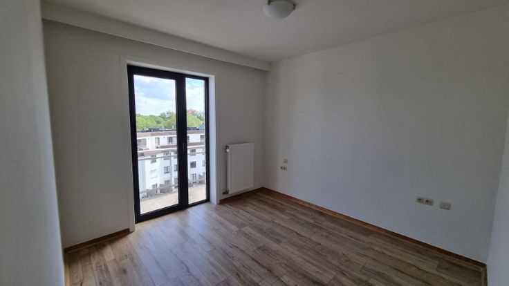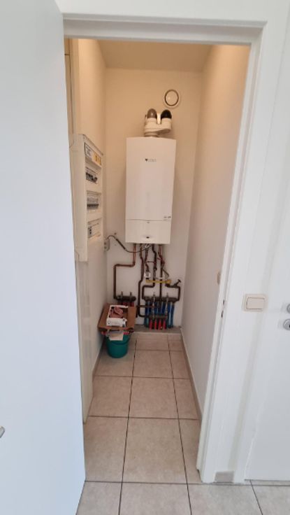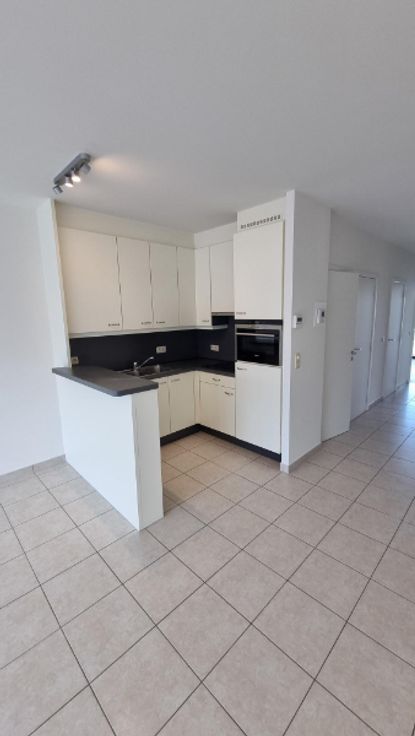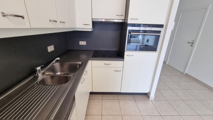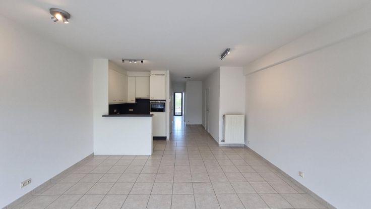 Het appartement omvat: inkom, woonkamer met open keuken, berging, toilet, 2 slaapkamers die uitgeven op het zonnig balkon achteraan, badkamer (lavabo en douche in bad) en kelderberging.