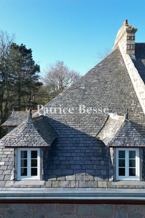 Le logis sous sa forme actuelle fut construit puis agrandi dans la première moitié du 20ème siècle en pierres de réemploi, principalement issues du démontage de manoirs et abbayes de la région. Il présente un volume massif, des façades sobres et non ordonnées percées de nombreuses baies. La toiture d'ardoises à chenaux débordants affiche une certaine fantaisie. Elle est ponctuée de multiples lucarnes à croupe, surmontées d'épis de faitage tous différents.