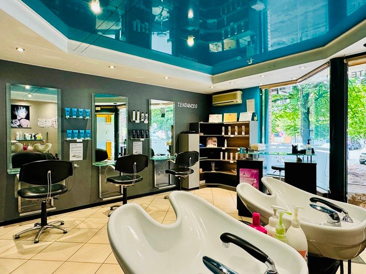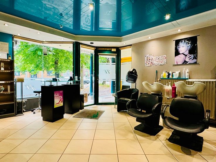 Mobiliers : 3 miroirs avec sièges et tablettes, 2 bacs de rinçage avec sièges, comptoir, étagères/présentoirs + matériel de coiffeurs.