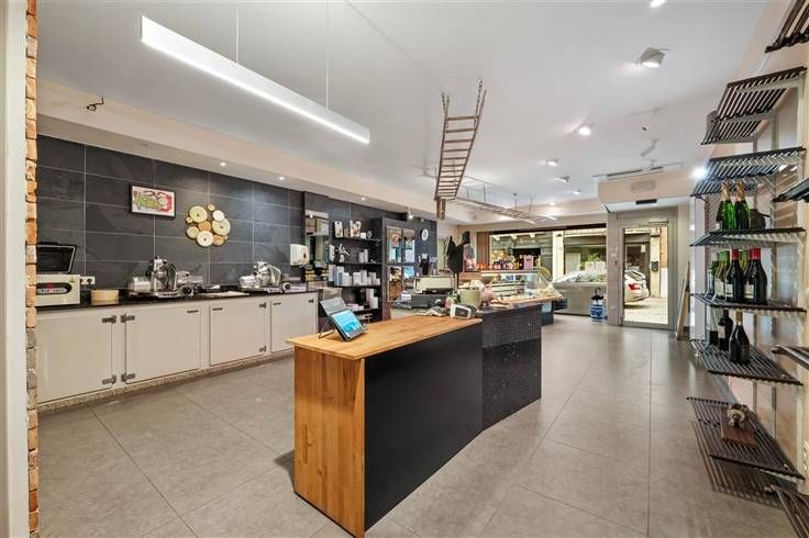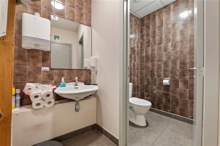 Naast de eigenlijke handelsruimte omvat het gelijkvloers nog meerdere werkruimtes, een keuken, koelruimtes, toiletten, enzovoort.
