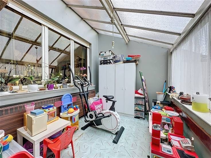 - Gelijkvloers niveau: Inkomhall met toilet, salon en eetkamer, keuken en veranda.