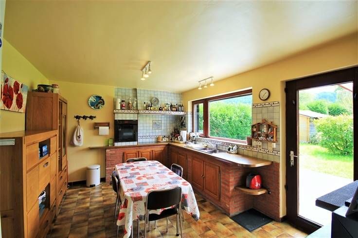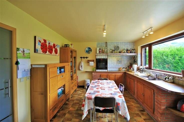 Vous trouverez un spacieux et lumineux séjour de 36m², agrémenté par une cassette au bois et offrant une agréable vue sur la terrasse et les extérieurs et une cuisine toute équipée avec coin repas de +/- 18 m².