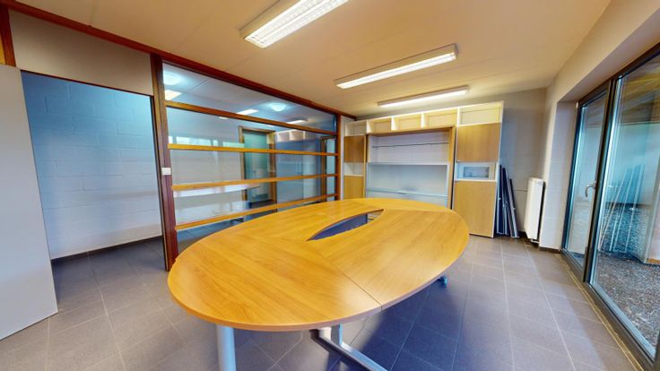 Les bureaux incluent un bureau d'accueil, deux bureaux supplémentaires, une salle de réunion avec espace cuisine, un vestiaire avec douche, un local technique, un local informatique et un grand garage avec porte sectionnelle, offrant un environnement de travail fonctionnel et confortable.