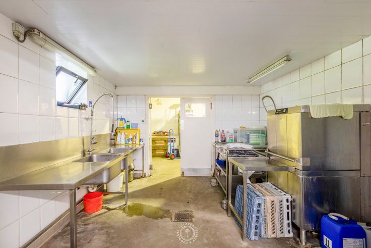 Het bijgebouw heeft een oppervlakte van ca. 234 m² op de gelijkvloerse verdieping en heeft volgende indeling: centrale inkom met sectionaalpoort, professionele keuken, wasplaats, koude keuken, magazijn, tweede inkomhal met toilet en trap naar de eerste verdieping.